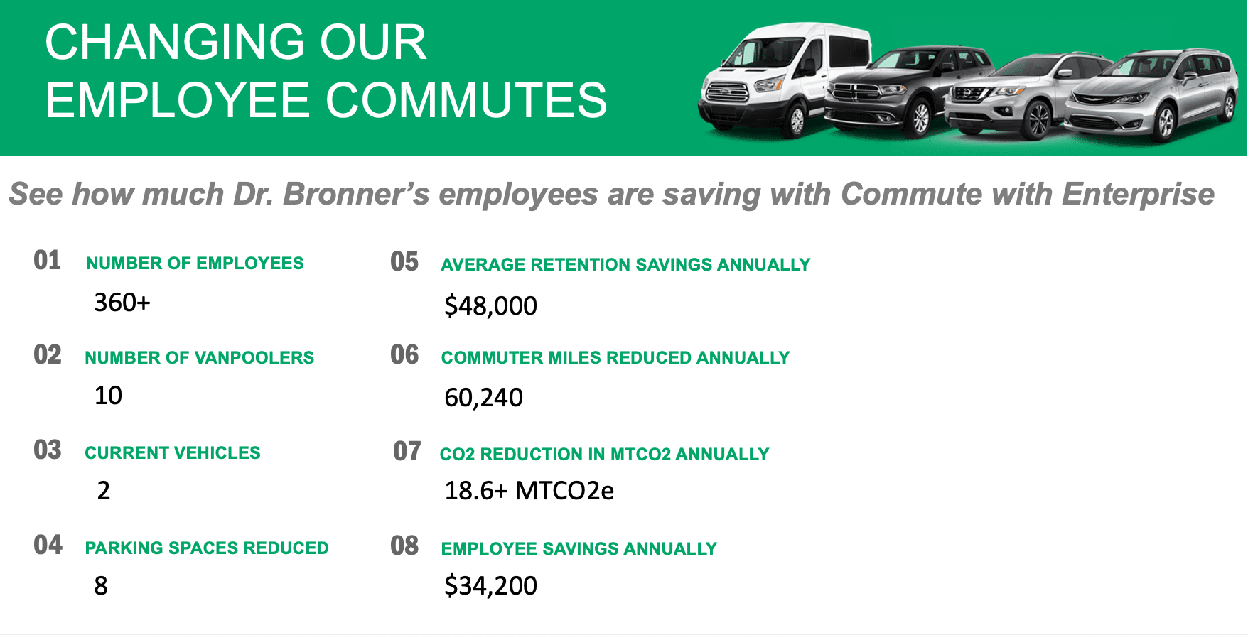 I am thrilled to share that Dr. Bronner’s has launched a new employee vanpool program through Commute with Enterprise! This exciting initiative is a testament to our commitment to both sustainability and employee welfare. At Dr. Bronner’s, we believe in treating our employees like family by creating an environment that supports growth, wellbeing, and success. Our new vanpooling program exemplifies this philosophy in action.