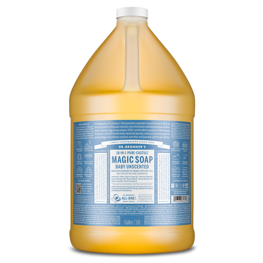 A gallon sized jug of Dr. Bronners 18 in 1 Pure Castile Magic Soap, Baby Unscented, with blue labeling featuring product details and usage information, highlighting its organic ingredients [1 Gallon]