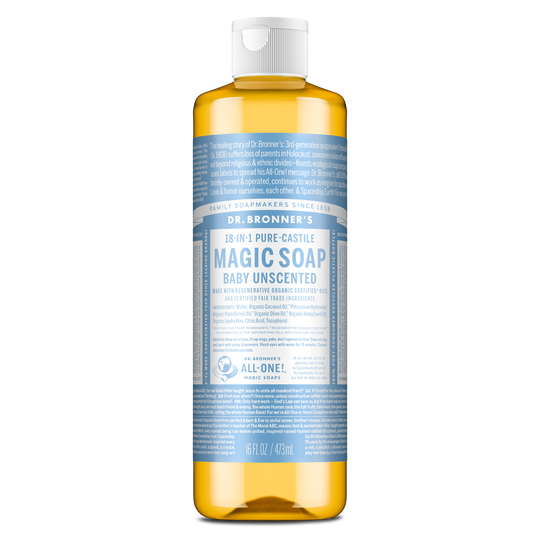 Gentle yet effective, Dr. Bronner’s Baby Unscented Liquid Soap is great for sensitive skin. Made with a nourishing blend of Regenerative Organic Certified® oils and double the olive oil, this true soap creates a rich, luxurious lather that rinses clean. Free from added fragrance, it’s ideal for babies (when diluted) and anyone sensitive to scents. Crafted with organic, ethically sourced ingredients and no detergents, dyes, or foaming agents. Vegan, made with organic oils, fair trade, and EWG Verified® for a safer, more sustainable clean—for you and your family!