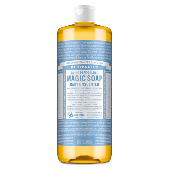 A bottle of Dr. Bronners 18 in 1 Pure Castile Magic Soap, Baby Unscented, containing 32 fl oz , stands upright against a white background, featuring cascading text and detailed product information [32 oz]