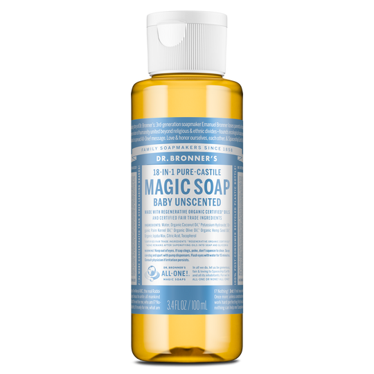 A bottle of Dr. Bronners 18 in 1 Pure Castile Magic Soap, Baby Unscented, with regenerative organic certification. Text includes usage instructions and a 3.4 fl. oz. capacity indication [3.4 oz]