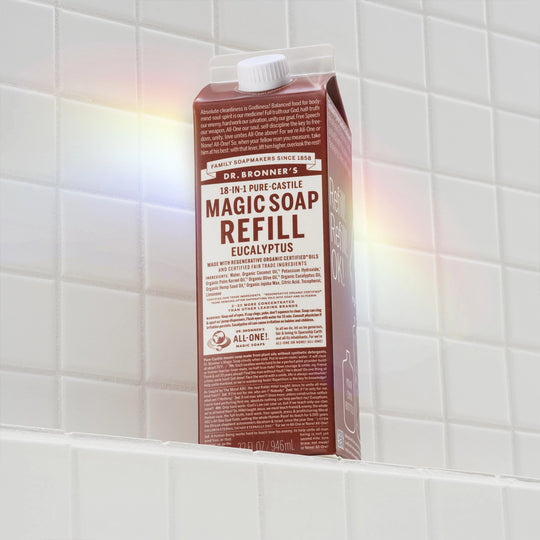 Our Pure-Castile Liquid Soaps are made from plant-based oils and contain no synthetic detergents or foaming agents. Our soap is shown to be readily biodegradable under the stringent testing conditions utilized pursuant to OECD Guideline 310. Recycle anywhere paper milk cartons are accepted.