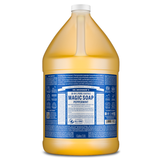 A half gallon bottle labeled Dr. Bronners 18 in 1 Pure Castile Magic Soap Peppermint displayed against a plain background, highlighting its diverse uses and organic ingredients. Text includes product details and usage instructions  [64 oz, 1/2 Gallon]