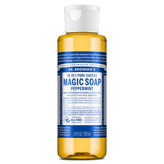 A 3.4 fl oz bottle of Dr. Bronners 18 in 1 Pure Castile Magic Soap Peppermint features a blue label with white text detailing its regenerative organic certified oils and fair trade ingredients [3.4 oz]